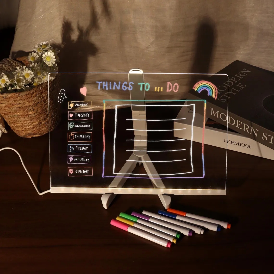 Trasforma qualsiasi stanza in un'oasi creativa con questa accattivante lavagna a LED in acrilico. Realizzata in ABS resistente e acrilico ad alta trasparenza, la lavagna si illumina tramite USB (DC 5V/1A) per diffondere una luce radiosa che mette in risalto i tuoi messaggi, scarabocchi e disegni. Sono incluse 7 penne dai colori vivaci, così puoi scarabocchiare, scrivere appunti motivazionali o decorare il tuo spazio con opere d'arte luminose.