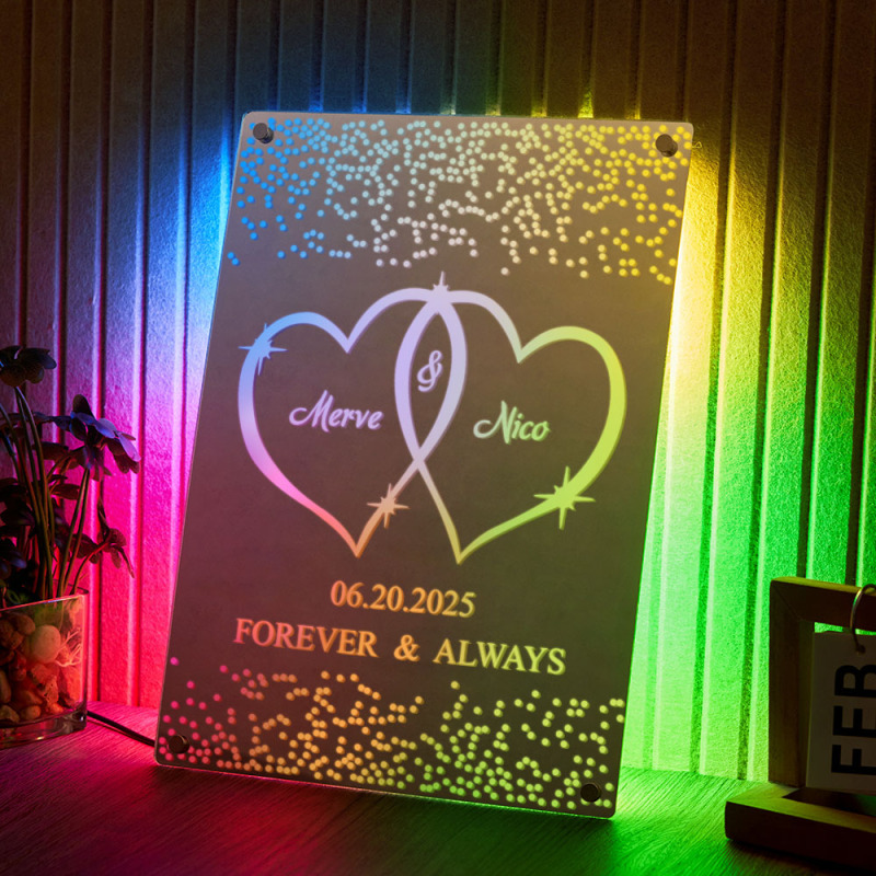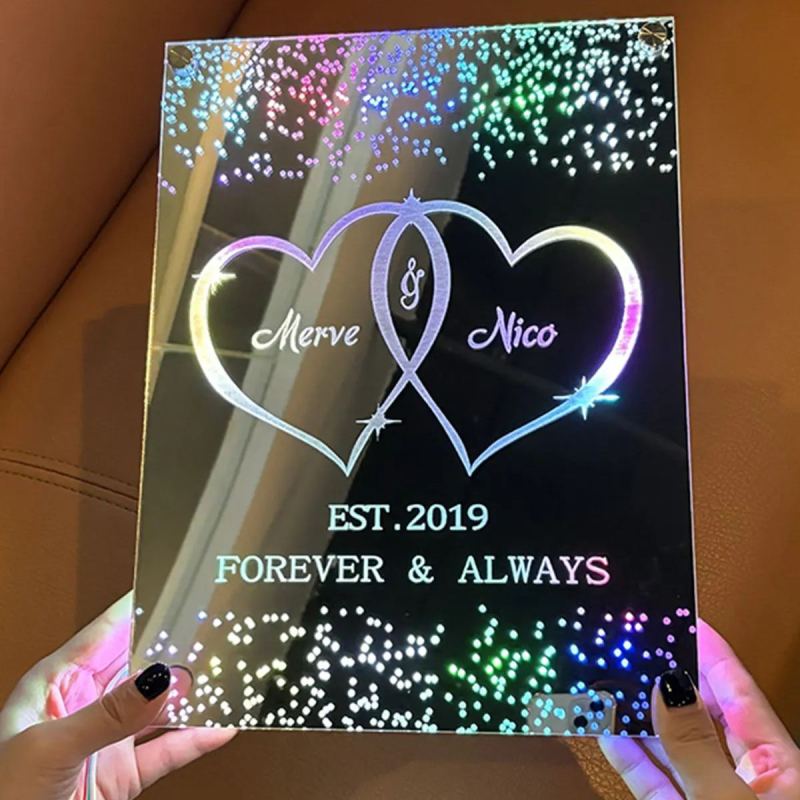 La nostra luce a specchio a LED personalizzata con nomi è il regalo romantico perfetto per anniversari, matrimoni o San Valentino. Caratterizzata da due cuori intrecciati e nomi personalizzabili, questa luce a specchio cattura il vostro legame eterno in uno straordinario gioco di luci e riflessi. La morbida illuminazione a LED crea un'atmosfera accogliente e romantica, perfetta per comodini, soggiorni o come ricordo di nozze.