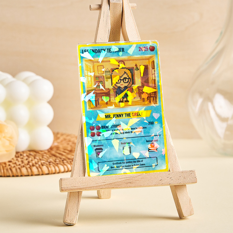 Il regalo perfetto per dimostrare il tuo affetto! Progettato come una carta collezionabile personalizzata, questo ricordo unico trasforma l'insegnante nel suo personaggio da collezione, con nome e statistiche di potere per un tributo davvero indimenticabile.